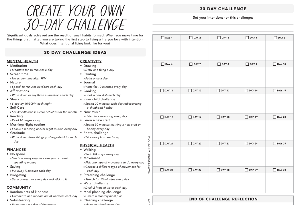 The free Create Your Own 30-Day Challenge guide will help you design a personal challenge that fits your goals—whether it’s health, creativity, finances, or building better daily habits. Use it to pick a challenge idea, write down your daily actions, and track your progress one day at a time. At the end of 30 days, reflect