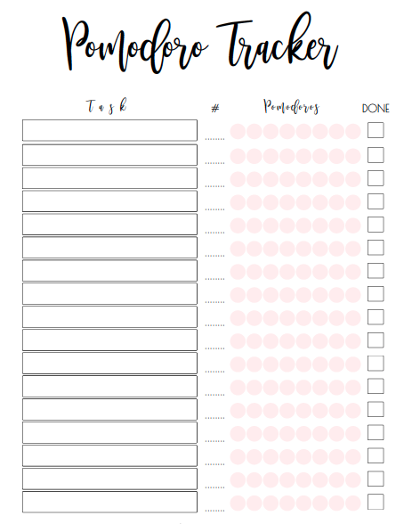 Check out this everyday Pomodoro tracker where you can record each Pomodoro you’ve completed. If you have never heard of Pomodoro method, click here to